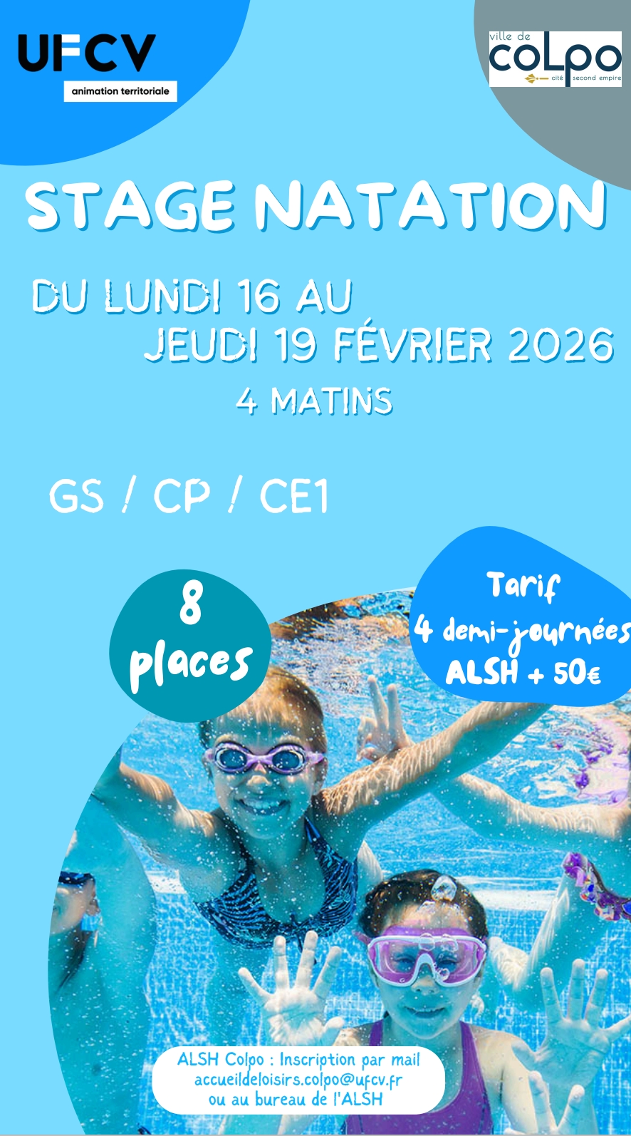 L’accueil de loisirs de Colpo organisera un Stage de Natation du lundi 16 au jeudi 19 février 2026.