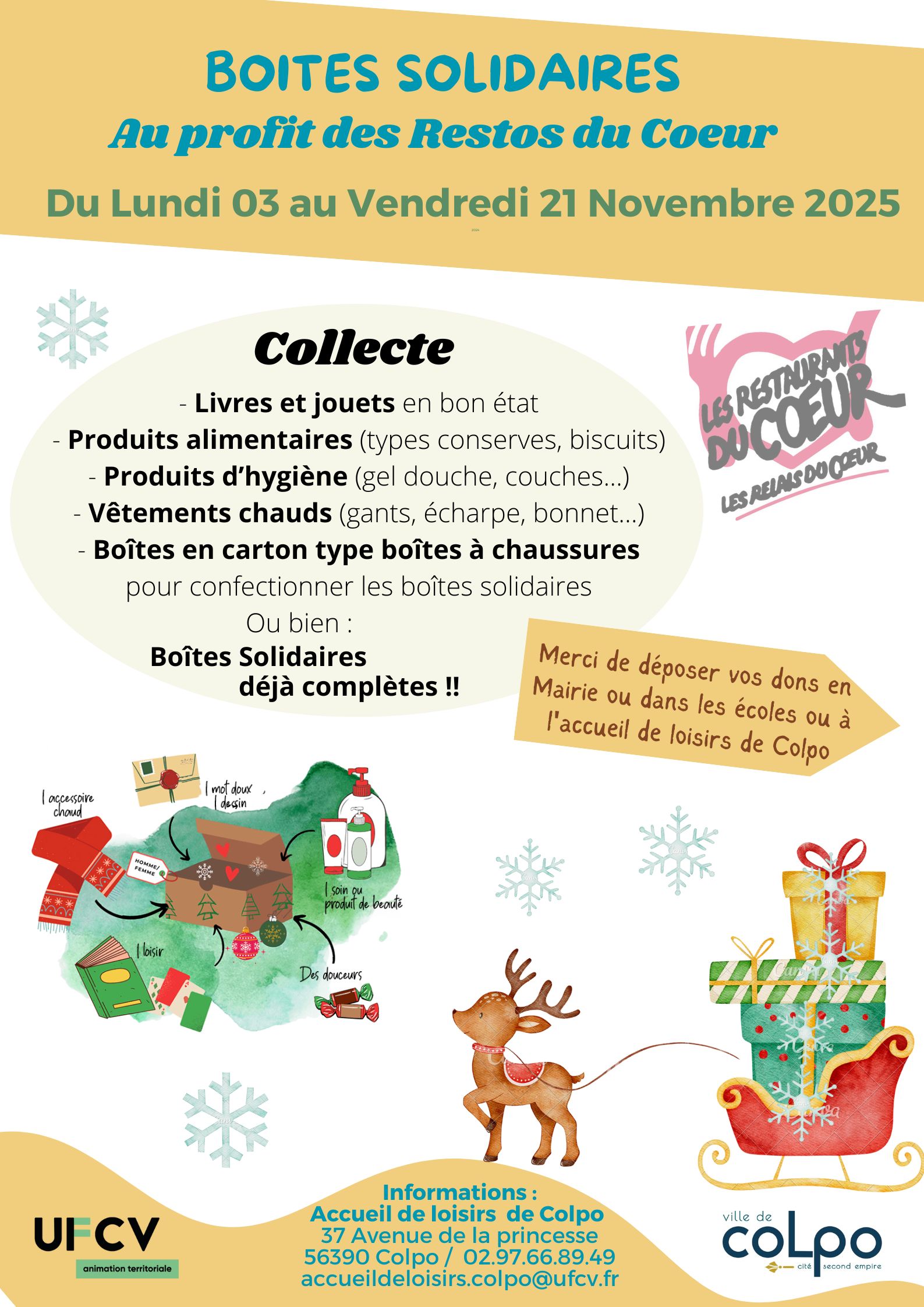 L'ALSH organise une collecte de livres, jouets, produits alimentaires et d'hygiènes, vêtements chauds et boîtes en carton au profit des bénéficiaires du Resto du Coeur.