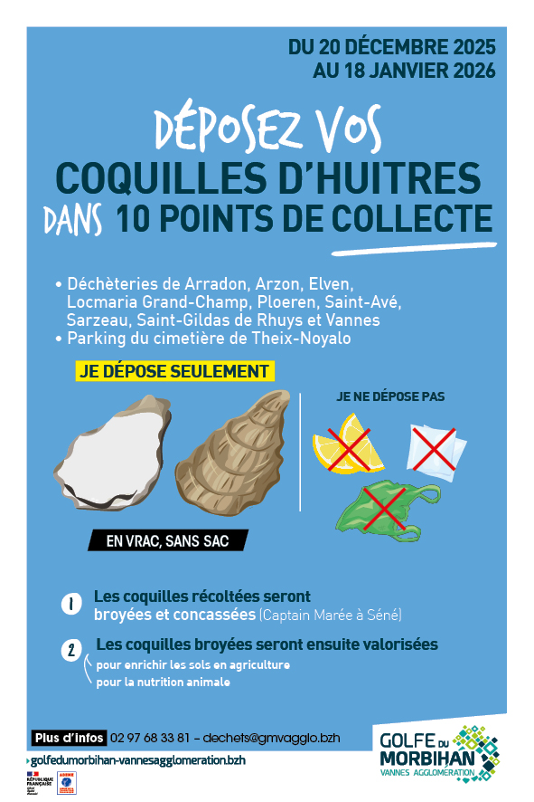 Les coquilles sont à déposer en vrac sans sac, et sans indésirables (coquilles uniquement : pas de restes de crustacés, pas de serviettes, citron, rince-doigts....